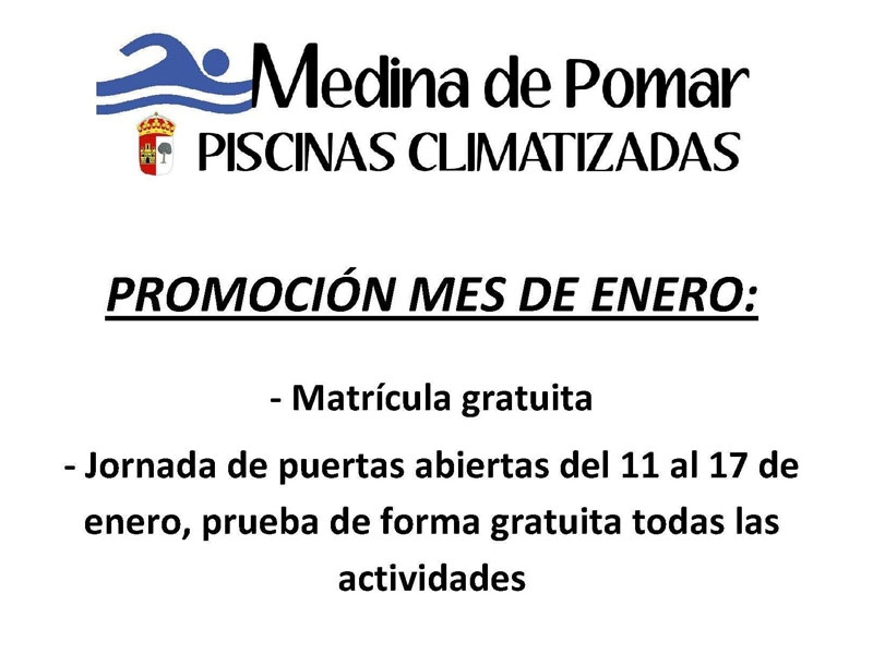 Las piscinas climatizadas de Medina de Pomar ponen en marcha una nueva promoción para el mes de enero. Todo aquel que lo desee podrá disfrutar de las instalaciones, de forma gratuita, desde mañana, 11 de enero, hasta el dÃa 17.